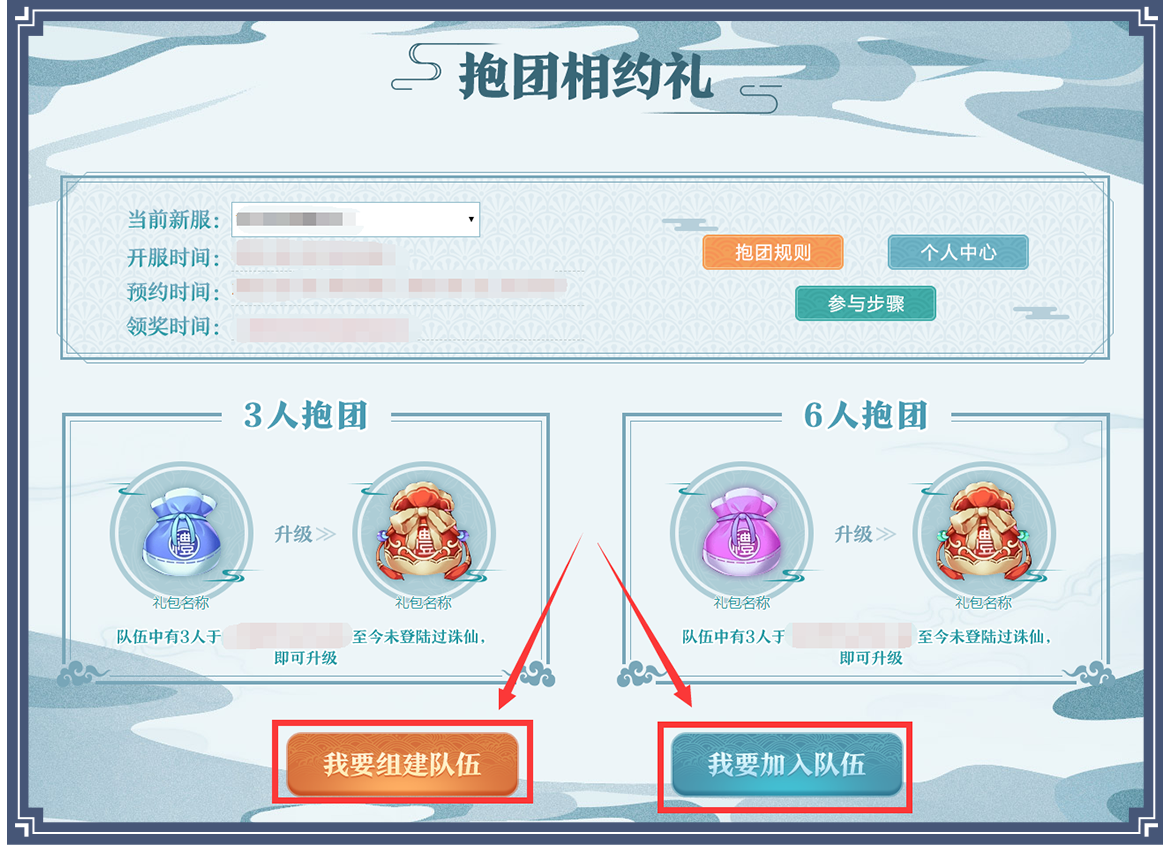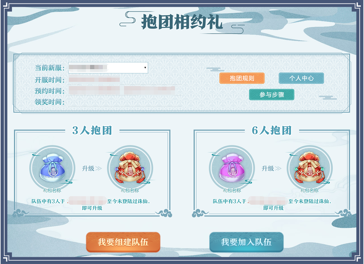 新服预约时间内,多位仙友可组队预约好礼,您可以选择创建队伍邀请别人加入,也可以加入别人已经创建的队伍。组队人数越多,奖励越好,如果队伍中有超过3人是最近30天未登录的流失玩家,奖励还可以升级哦。