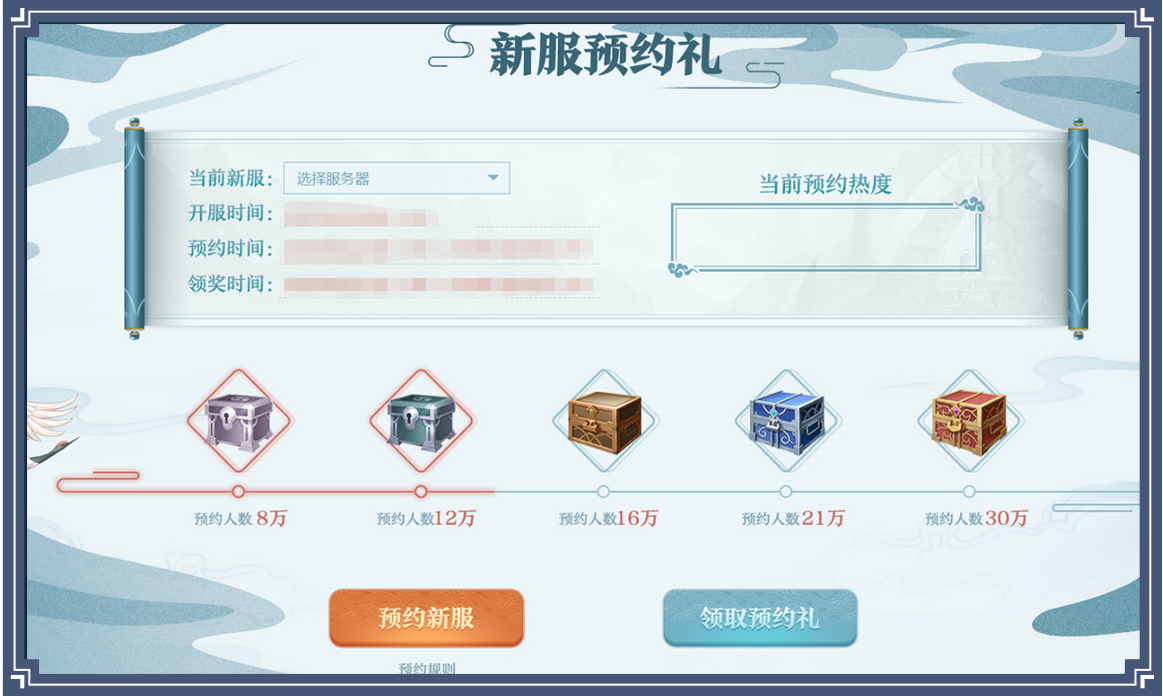 在新服预约时间内,使用账号预约新服,会增加当前新服的预约热度,当预约热度达到一定额度,可以获得相应礼包。