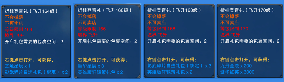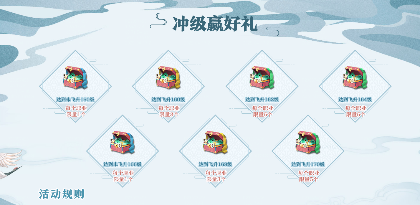 2)活动奖励设置为七档奖励,达到未飞升150级、飞升160级、飞升162级、飞升164级、飞升166级、飞升168级、飞升170级的角色均有机会抢占奖励。