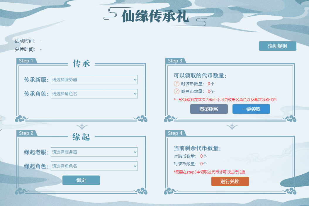 2)仙友们在登录后,需要先在缘起中选择对应新服角色并在传承中选择对应老服角色进行绑定。绑定成功后,仙友方可进行该活动的代币领取和礼包兑换功能。