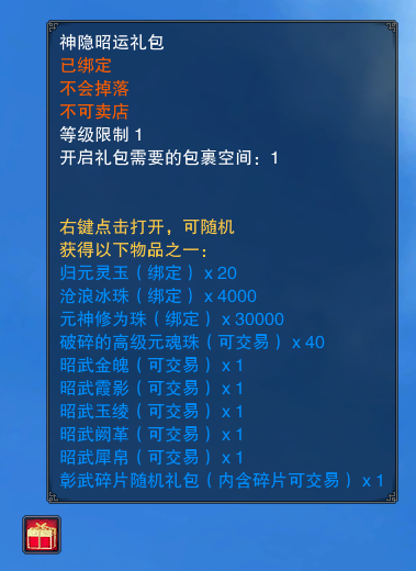 当前新服充值积分达到500积分后,每个账号可以免费领取1次昭武/煌武助战礼包,打开礼包后可领取“昭武阙革(绑定)”*30、煌武·极意天问先天珠以及后续项链升级路径。2024年1月1日后打开后可额外领取“昭武犀帛(绑定)”*30 。