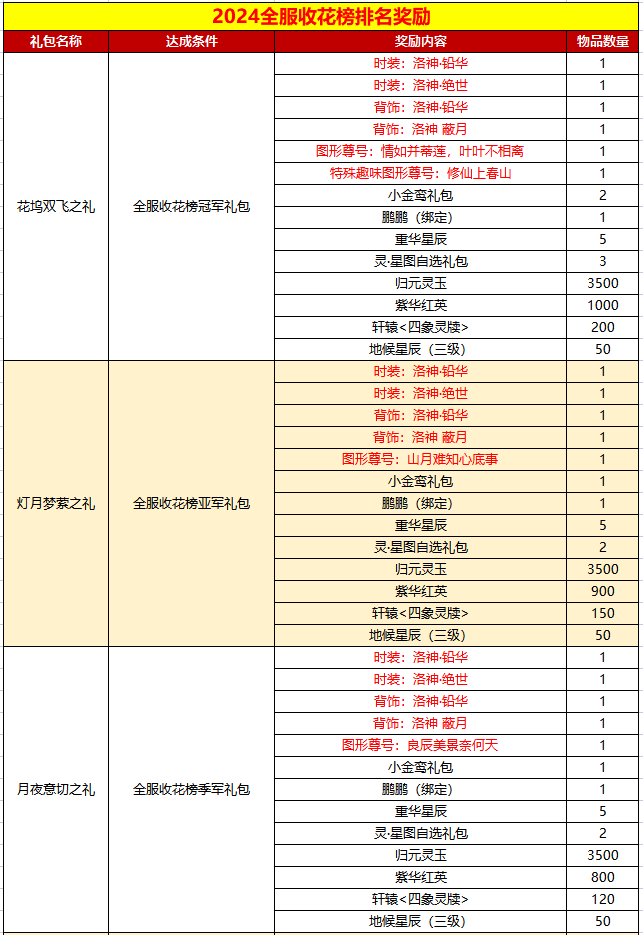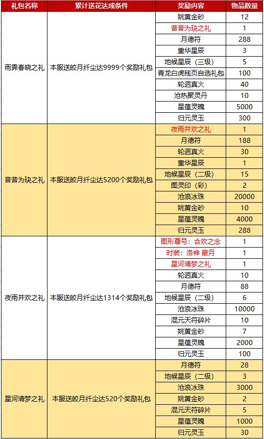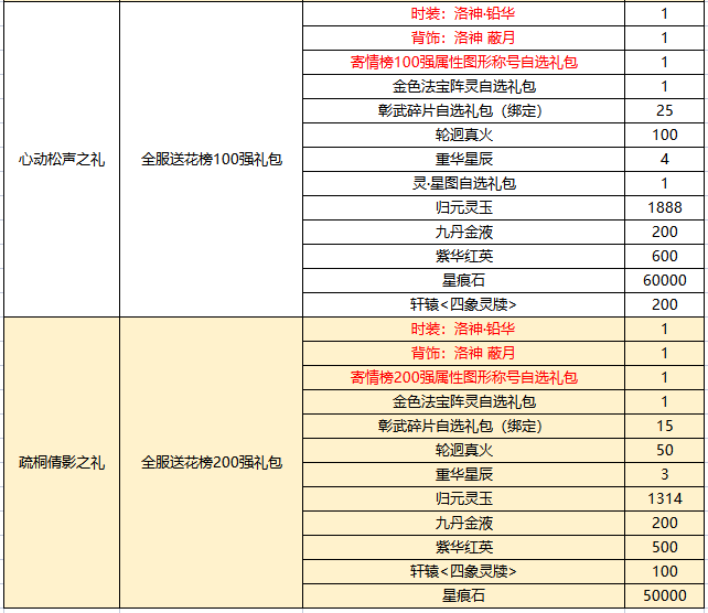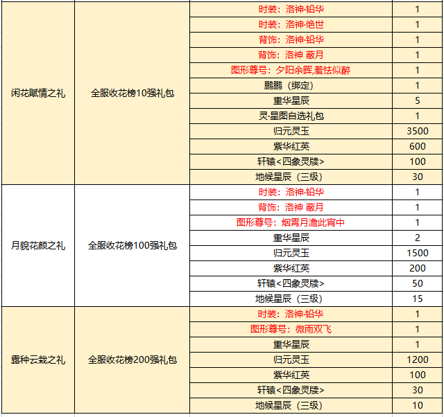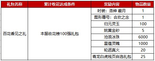 包含本服累计达成礼包、本服收花100强礼包、参与奖礼包