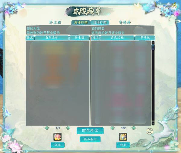 1、活动期间内,根据仙友送/收皎月纤尘的数量进行本服排名