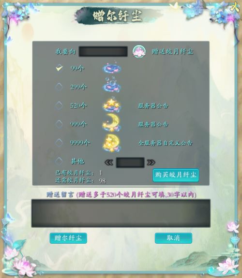 送皎月纤尘界面,输入或复制粘贴收皎月纤尘仙友角色名(点击输入名称后面的皎月纤尘