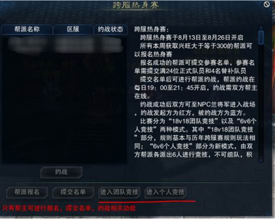 <1>所有本周获取兴旺大于等于300的帮派可以报名热身赛。跨服热身赛只有帮主可进行报名,提交名单,约战相关功能。