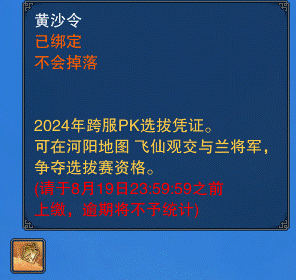 获得令牌的帮主与帮派成员在河阳城 兰将军处点击“跨服PK争霸赛”按钮后,选择“上缴令牌”按钮可上交一个【黄沙令】。