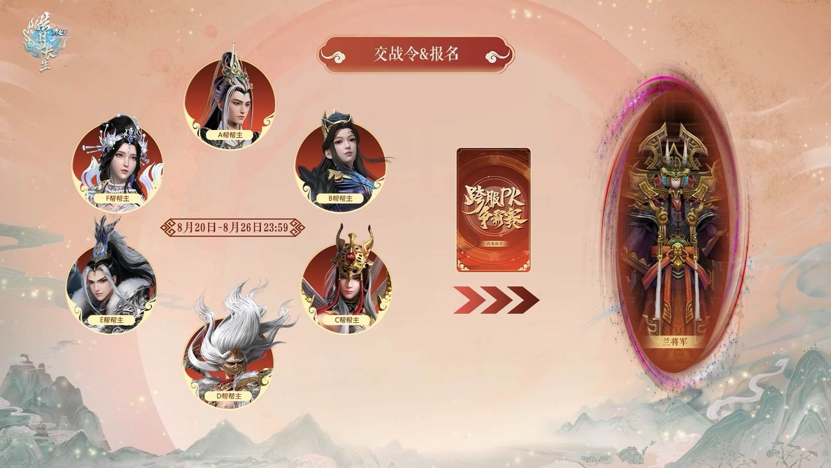 6)在交战令活动结束后,各位仙友可在本服 河阳-兰将军 处查看本服获得参与跨服PK争霸赛资格的帮派名单。