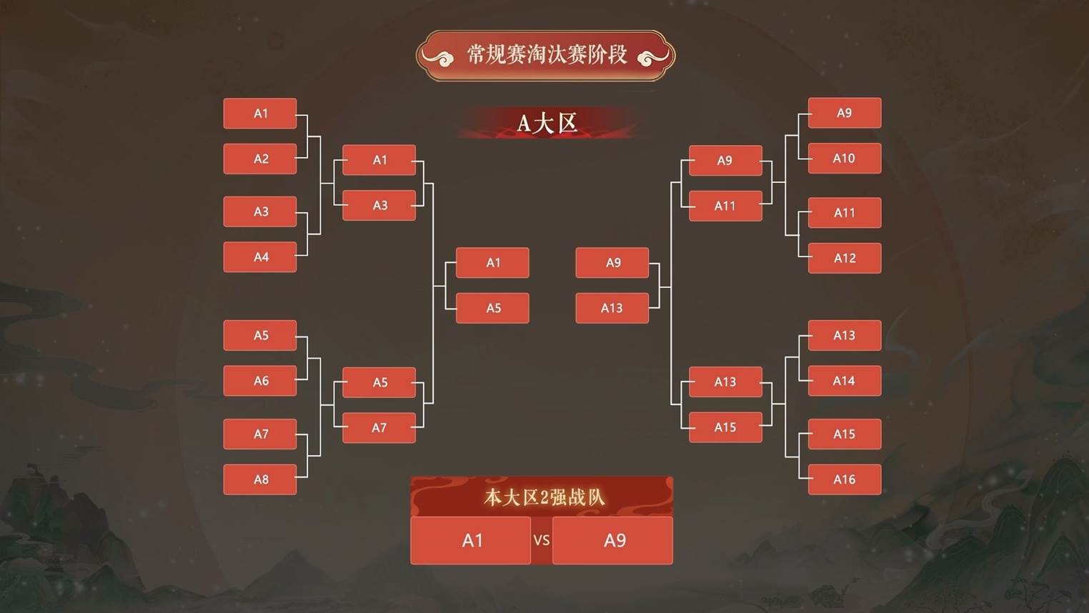 2)战队将按抽签编号分为A-H八大赛区,每个赛区内的帮派按对阵表进行单场淘汰赛。