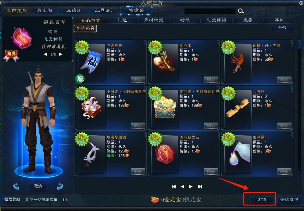 点击游戏右下角天帝宝库按钮或按ALT+J键呼出天帝宝库,点击充值按钮完成10元宝充值后可以获得奖励。