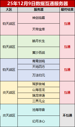 我们将会在12月9日8:00-15:00进行数据互通工作,如遇特殊情况时间将顺延,同时受合服影响,所在大区的所有服务器及天界开启时间也将与此同步,给您带来的不便敬请谅解。具体规划如下: